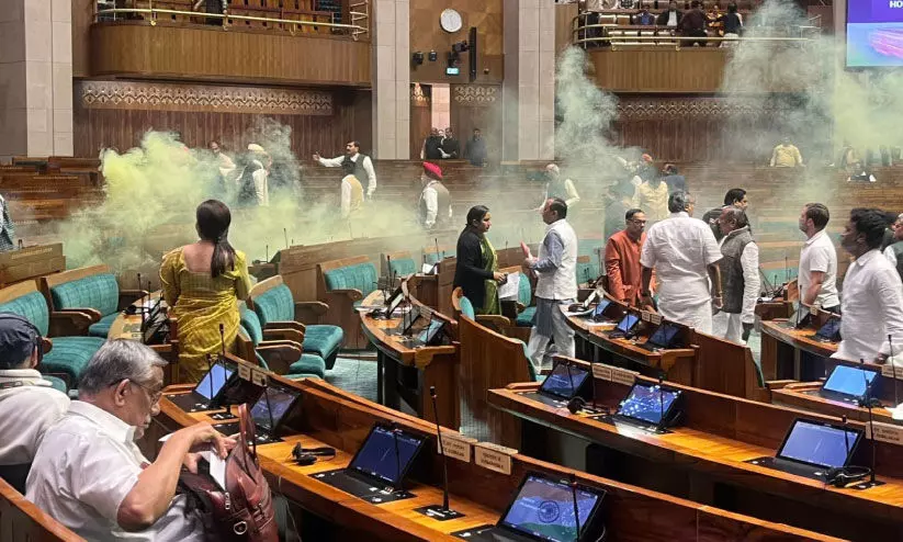 text_fieldsഇന്ത്യൻ പാർലമെന്റ് മന്ദിരത്തിൽ കടന്നുകയറിയ യുവാക്കൾ പുകത്തോക്ക് പൊട്ടിച്ച് പുക പടർത്തിയപ്പോൾ