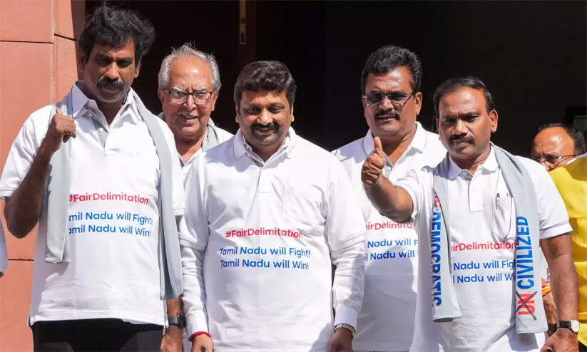 ശനിയാഴ്ച ചെന്നൈയിൽ മുഖ്യമന്ത്രി എം.കെ. സ്റ്റാലിൻ വിളിച്ച യോഗത്തിന്റെ പശ്ചാത്തലത്തിലാണ് ഡി.എം.കെ പാർലമെന്റിനകത്തെ പ്രതിഷേധം കടുപ്പിച്ചത്. ‘നീതിപൂർവകമായ മണ്ഡല പുനർനിർണയം: തമിഴ്നാട് പൊരുതും, തമിഴ്നാട് ജയിക്കും’ എന്നെഴുതിയ ടീഷർട്ടും അപരിഷ്കൃതരല്ല പരിഷ്കൃതർ എന്നെഴുതിയ ഷാളുമണിഞ്ഞ് ഇരു സഭകളും സമ്മേളിക്കും മുമ്പ് പുതിയ പാർലമെന്റിന്റെ മുഖ്യ കവാടമായ മകരദ്വാറിൽ പ്രതിഷേധിച്ച ശേഷമാണ് ഡി.എം.കെ എം.പിമാർ അതേ വേഷത്തിൽ ലോക്സഭയിലെത്തിയത്.