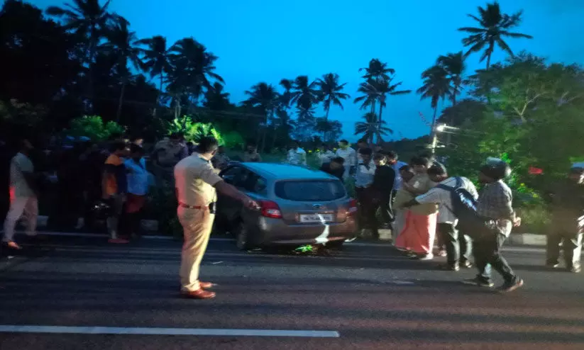 text_fieldsടിപ്പർ ഇടിച്ചതിനെ തുടർന്ന് ഡിവൈഡറിൽ കുടുങ്ങിയ കാർ