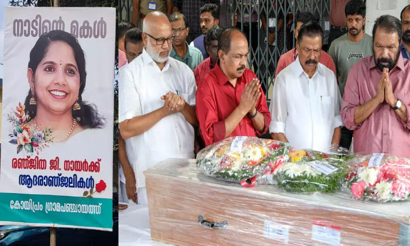 സംസ്ഥാന സർക്കാറിനുവേണ്ടി മന്ത്രി വി.എൻ. വാസവൻ അന്ത്യോപചാരം അർപ്പിച്ചു. തുടർന്ന് 1.30ഓടെ മൃതദേഹം പാതിപൂർത്തിയായ വീട്ടിലേക്ക് മാറ്റി. അതുവരെ തെളിഞ്ഞുനിന്നിരുന്ന മാനം പെട്ടെന്ന് നിറഞ്ഞൊഴുകി. മഴക്കിടെ സ്വപ്നവീട്ടിലേക്ക് ചേതനയറ്റ് എത്തിയ രഞ്ജിതയെ വരവേറ്റത് കൂട്ടക്കരച്ചിലായിരുന്നു.