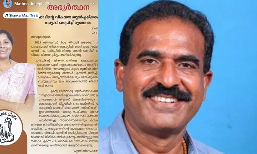 CPI(M) വേങ്ങൽ ലോക്കൽ കമ്മറ്റി അംഗം, മുൻ പെരിങ്ങര ഗ്രാമപഞ്ചായത്ത് പ്രസിഡൻ്റ് എന്നീ നിലകളിൽ പ്രവർത്തിച്ച് പാർട്ടിയേയും ജനങ്ങളെയും വഞ്ചിച്ച മാത്തൻ ജോസഫ് സംഘടനാ വിരുദ്ധ നിലപാടിന്റെയും സ്വന്തം വീട്ടിൽ നിന്നും ഭാര്യയെ സ്ഥാനാർത്ഥിയായി സ്വയം പ്രഖ്യാപനം നടത്തി ജനങ്ങളെ വിണ്ടും വഞ്ചിക്കാൻ വേണ്ടി എൻ്റെ ഭാര്യ ലീലാമ്മ മാത്തന് വോട്ടു ചെയ്യണമെന്ന് ആവശ്യപ്പെട്ടുകൊണ്ട് വീടുകളിൽ കയറി തെരഞ്ഞെടുപ്പ് പ്രചാരണം നടത്തുകയാണ്.