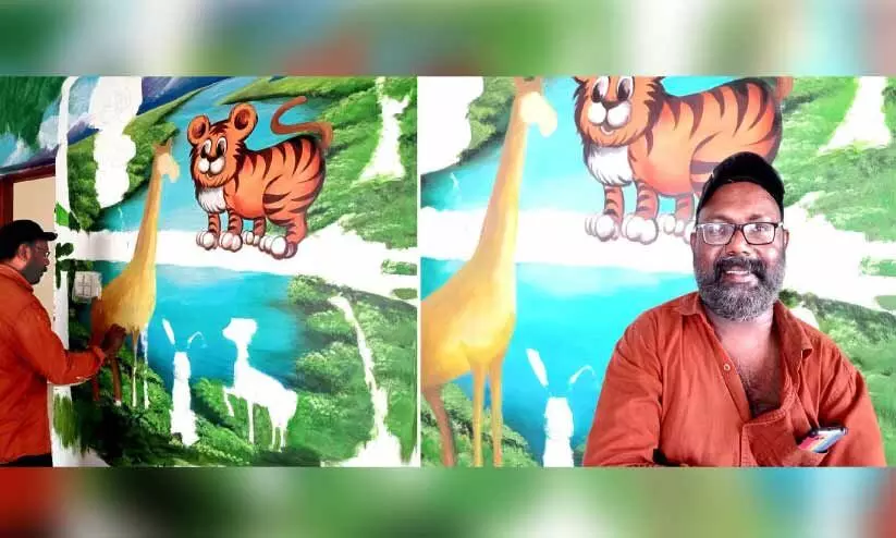 രണ്ടാഴ്ച മുമ്പാണ് ജലജീവന് മിഷന്റെ പ്രചാരണാർഥം ചിറ്റുമല ജങ്ഷനിലെ കാത്തിരിപ്പ് കേന്ദ്രം മൂന്നുദിവസം കൊണ്ട് സുന്ദരകാഴ്ചയുടെ ഇടമാക്കി മാറ്റിയത്. ഒരു സഹായി പോലും ഇല്ലാതെയാണ് വര. ചാരേണിയുടെ മുകളില്നിന്ന് മണിക്കൂറുകളെടുത്താണ് പല ചിത്രങ്ങളും പൂര്ത്തിയാക്കുന്നത്. അവിവാഹിതനാണ്. മാതാപിതാക്കള് മരിച്ചതോടെ ഒറ്റക്കാണ് താമസം.