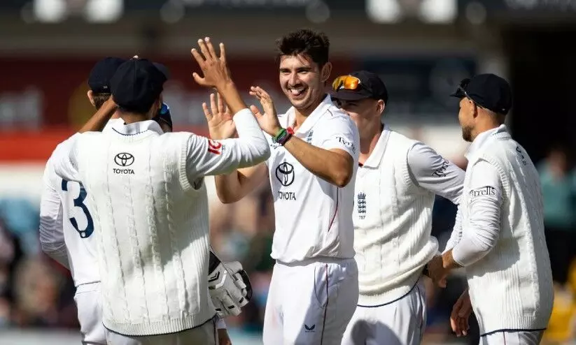 text_fieldsവിക്കറ്റ് നേട്ടം ആഘോഷിക്കുന്ന ഇംഗ്ലിഷ് താരങ്ങൾ