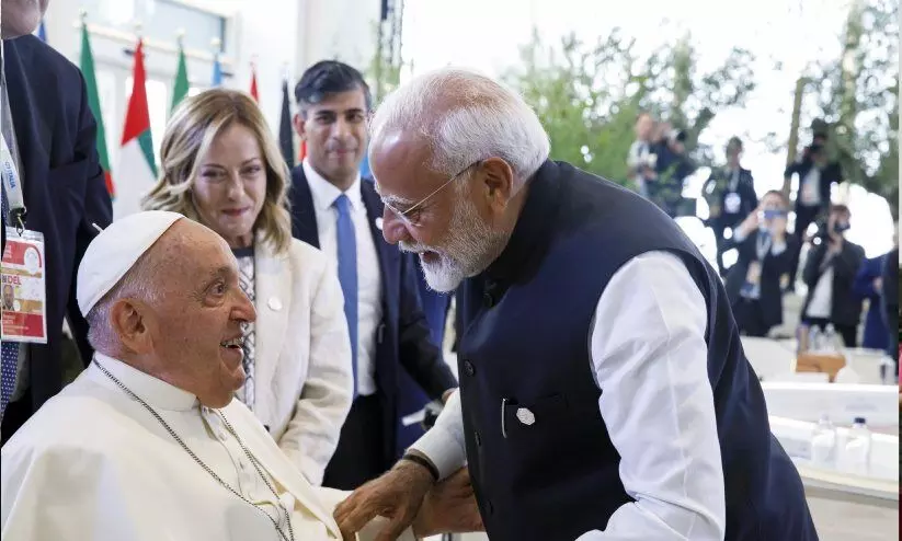 text_fieldsജി 7 ഉച്ചകോടിക്കിടെ മാർപാപ്പയുമായി സംസാരിക്കുന്ന പ്രധാനമന്ത്രി മോദി